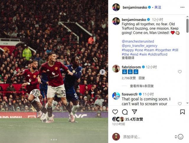 舍什科写道:“团结在一起并肩战斗,无所畏惧。老特拉福德气氛热烈,所有人目标一致,继续前进!加油曼联!”