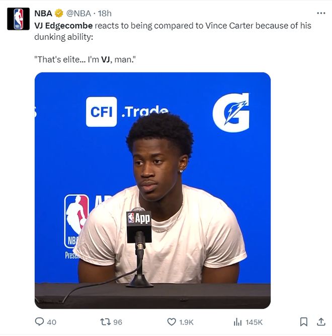 赛后有记者询问埃奇库姆的扣篮跟文斯-卡特是否有相似之处?埃奇库姆说:卡特?那才是真的精英级的扣将。