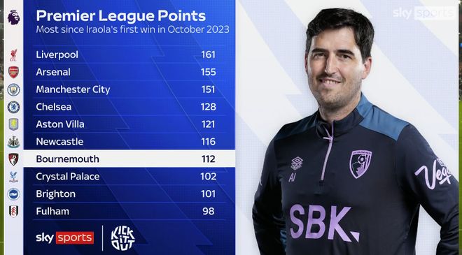 雷速体育10月4日宣 据英国天空体育统计的数据显示,自2023年10月份,伯恩茅斯主帅伊劳拉带队取得首胜之后至今,樱桃军团在英超联赛累计取得了112分,位列英超第七,超越曼联、热刺等传统Big6战队。