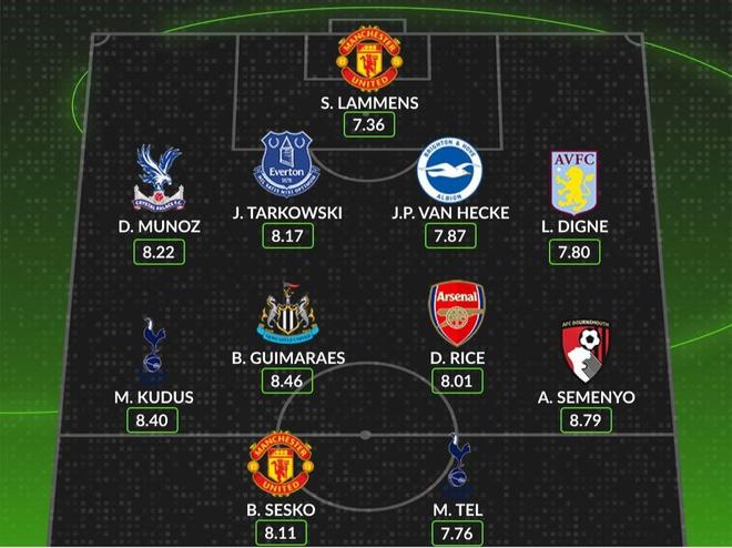 中场:库杜斯(热刺)、吉马良斯(纽卡)、赖斯(阿森纳)、塞梅尼奥(伯恩茅斯)