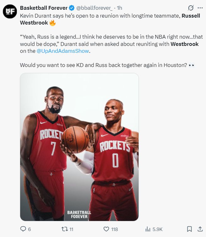 KD的言论至少能证明,他在互联网上听到一些消息说威少可能加盟火箭,他自己也愿意再度跟威少联手,而且杜兰特认为威少应该由自己来决定是否留在NBA打球或离开NBA,不该是这个联盟主动抛弃威少。