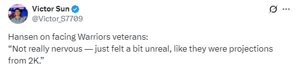 赛后谈到首次在赛场上对阵库里等勇士老将的感受,杨瀚森表示:那倒是不紧张,感觉人有点像是2K里投射出来的。