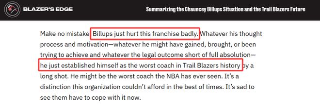 毋庸置疑,比卢普斯给开拓者队造成了严重伤害。无论他的初衷、动机是什么,无论他从中获得了什么、试图达成什么目标,也无论最终法律结果如何(除非完全洗清罪名),他都已成为“开拓者队史最差主帅”,甚至可能是“NBA历史最差主帅”之一。开拓者队即便在最好的时期也承受不起这样的打击,如今却不得不面对这一现实。