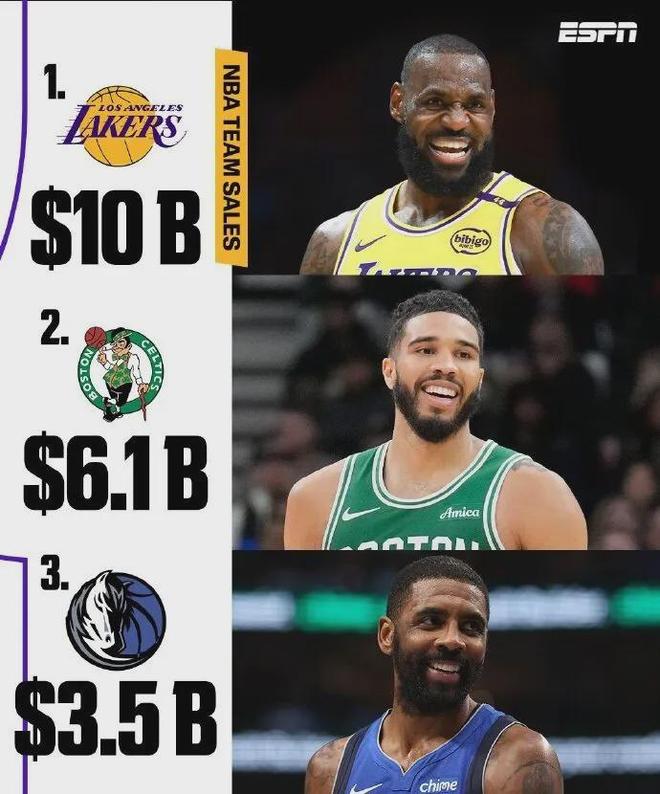 近年来NBA掀起了卖队潮,湖人之前,凯尔特人以61亿美元出售给由Symphony Technology Group联合创始人比尔-奇泽姆领衔的投资集团,独行侠以35亿美元出售给阿德尔森家族等等。
