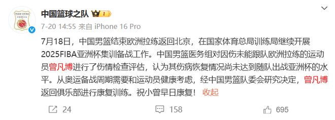 知名国内媒体人透露,由于恢复良好,曾凡博已决定接受郭士强的征召,将回国参加备战世预赛11月28日(主场)-12月1日(客场)的集训,到时中国男篮两战韩国男篮。