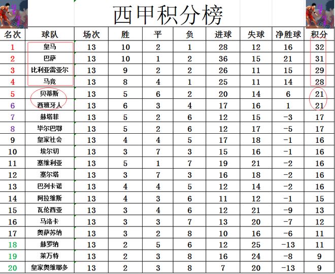 积分榜方面,皇马1分优势力压巴萨领跑,比利亚雷亚尔差皇马3分排在第3,马竞差皇马4分排在第4。西班牙人今天小胜止住颓势后,追上贝蒂斯,两队都是落后皇马11分,少马竞7分,争5相当激烈。