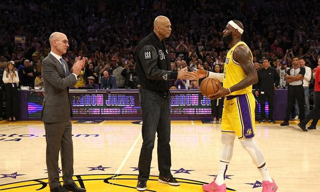 你能想象吗?一个从小在俄亥俄州阿克伦街头打球的孩子,有一天会站在NBA历史得分榜的最顶端,而把篮球亲手交到他手里的,是那个曾经遥不可及的名字——卡里姆·阿卜杜尔-贾巴尔。那天晚上,斯台普斯中心的灯光好像格外亮,全场起立,詹姆斯的妻子、孩子们都在场边,镜头扫过时,他眼眶有点红。贾巴尔站起来,捧着那颗象征纪录的球,一步一步走过来,说:“这是你的了。”那一刻,詹姆斯说,感觉不像真的,像是电影里的桥段,可它偏偏就发生了。