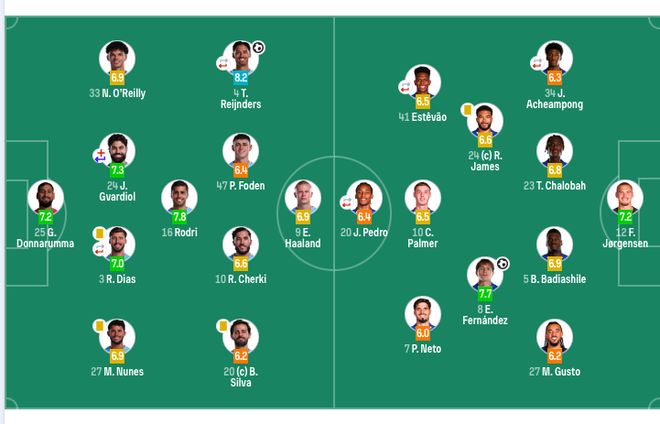 曼城首发:25-多纳鲁马、3-鲁本·迪亚斯(81’6-阿克)、24-格瓦迪奥尔(51’45-胡桑诺夫)、33-奥赖利、4-赖因德斯(70’11-多库)、16-罗德里、20-B席、27-努内斯、9-哈兰德、10-谢尔基、47-福登。