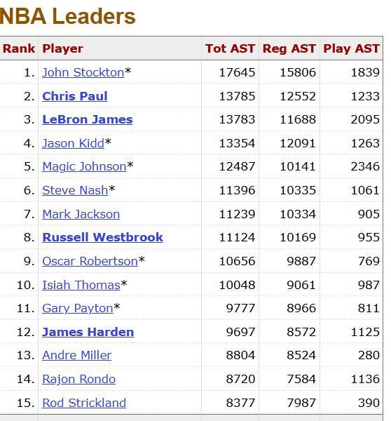 在前两节比赛中,詹姆斯5投2中拿到了8分3篮板3助攻,这也让他的生涯总助攻数(包含季后赛)达到了13786次,超越克里斯-保罗升至历史第二位。