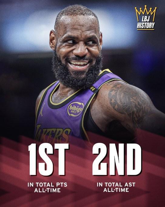 值得一提的是,他也是历史首位在总得分榜排名第一同时还能在总助攻榜上排名第二的NBA球员。