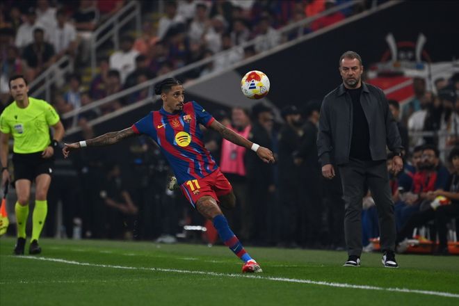 上半场,双方针尖对麦芒,各不相让。比赛在尾声阶段掀起狂潮:第36分钟,拉菲尼亚带球突入禁区左侧低射死角得手;第45+2分钟,维尼修斯穿裆过人后倒地扫射扳平;第45+4分钟,莱万接佩德里直塞禁区内挑射再度领先;第45+6分钟,贡萨洛角球混战中头球中柱入网再度扳平。